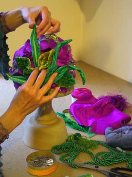 Stickerei und Putzarbeiten, Applikationen, handgefertigte Blüten und Posamente, Gestricktes und Gehäkeltes, alles was mit Nadel & Faden und mit zwei Händen möglich ist fliesst zusammen, um einer neuen Creation Gestalt zu verleihen.